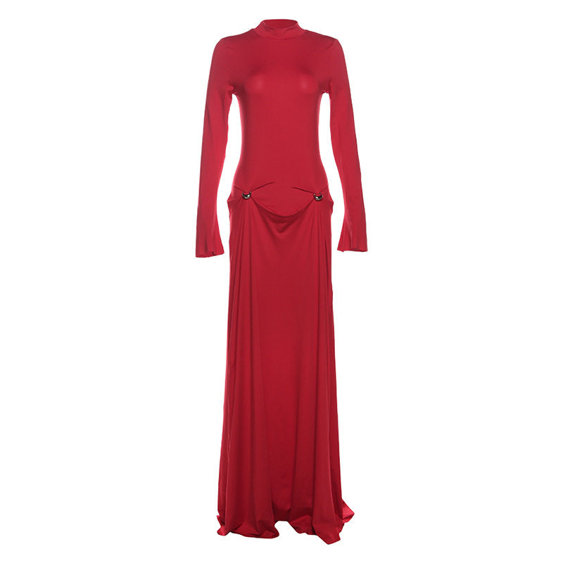 Bxucca | Red Half-Turtleneck Long-Sleeve Dress for Women – Floor-Length Elegant Flared Skirt