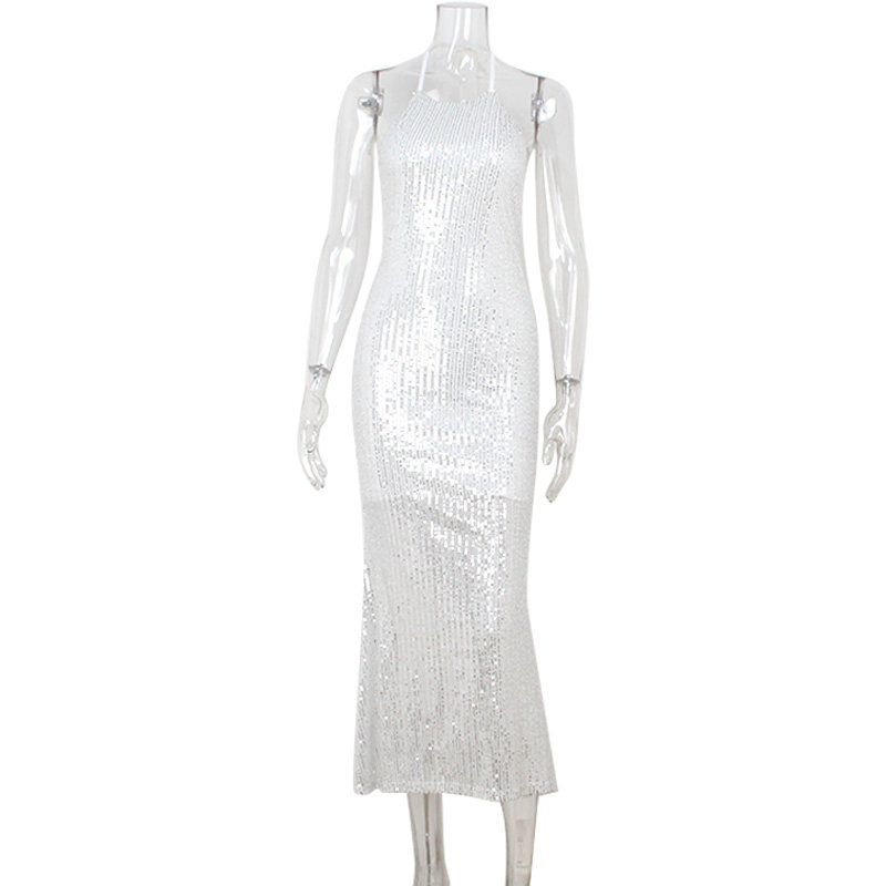 Bxucca | Sequin Halter Dress for Women – Sexy Backless Figure-Hugging Long Skirt